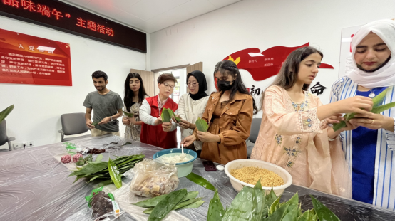 活动现场,粽叶清香四溢,社区志愿者热情地向职工传授包粽子的技巧。职工们仔细观察、认真学习,在社区志愿者手把手的指导下,一个个形态各异的粽子逐渐成型。来自印度尼西亚的NACKITA VHIONICA笑着说:“以前只在文化课堂上了解过端午节,这次亲手包粽子,感觉特别有趣,让我更深刻地体会到中国传统文化的魅力。”