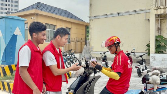 包完粽子,社区工作人员向职工们简要介绍了端午起源和传说、习俗和传统,让他们感受到节日背后深厚的文化底蕴。随后,在社区工作人员的带领下,职工志愿者前往社区所在街道,把热腾腾的粽子递送到环卫工人、有轨电车车站执勤人员、外卖小哥的手中,与户外工作者一同品味端午。户外工作者们对志愿者们的行动表达了最真挚的感激。一位外卖小哥动情地说:“平时忙起来顾不上过节,没想到有人专门送粽子来,真感动!谢谢志愿者们记挂着我们这些户外干活的,太贴心了!”