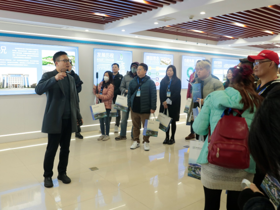 交流团一行随后前往公司老员工创新创业基地参观考察,详细了解公司特色的“五业融合”创业孵化模式及展厅陈列的师生共创的展品。来自材料公司的陆成龙博士向各位嘉宾介绍了自己利用黄石矿区产生的尾矿和矿渣研发的新型绿色建筑材料——发泡陶瓷,这种材料强度高、密度小,易于雕刻,解决了传统浮雕文化墙石材不便运输、雕刻与切割、工期较长的问题,并提出了一种利用发泡陶瓷板制作轻量化浮雕文化墙的方法,引发了不少台湾同胞的兴趣。